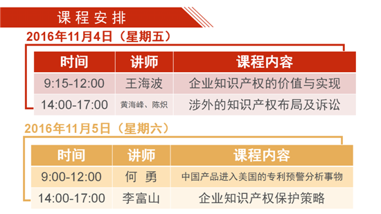 研修班共有6天课程,分三周举行,分别以“企业知识产权海外维权” “企业知识产权司法保护” “企业专利布局及风险防范”为主题。本周课程邀请了深圳市华信天线技术有限公司总裁王海波、美国众达律师事务所合伙人黄海峰律师和陈炽律师、美国莱纳戴维律师事务所驻广州代表处负责人何勇律师、深圳峰创智诚科技有限公司副总裁李富山等五位讲师进行授课。