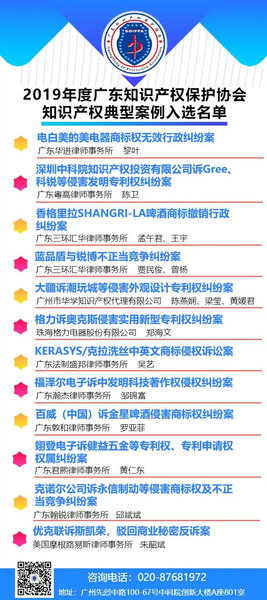 协会于2020年2月27日发布征集通知,面向全体会员单位征集自身或代理,并在2019年度结案的包括行政和司法程序的知识产权典型案例,截至2020年3月27日,共征集到申报案例52件,其中商标相关22件,专利相关21件,著作权相关3件,不正当竞争8件,其他(商业秘密、域名争议等)3件(部分案件同时涉及多个领域),涉及申报的会员单位共26家。随后,邀请了广东省高级人民法院知识产权庭原副庭长邱永清、广州知识产权法院主审法官丁丽、广州骏思知识产权代理有限公司总经理华辉、广东踔厉律师事务所合伙人田子军律师、北京大成(广州)律师事务所高级合伙人张春耀律师作为评审专家,根据评审标准,用时一周,从案例的代表性、疑难性、影响力、专业性和新颖性五个方面对申报的案例进行了全面评析,并于4月16日召开了现场评议专家评审会。经过专家们的评议和热烈讨论,最终评选出“2019年度广东知识产权保护协会知识产权典型案例”12件。