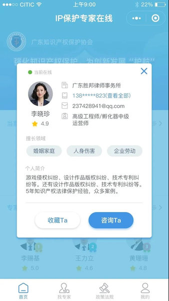 小程序提供知识产权行业专家信息,无论是日常咨询,还是业务合作交流,皆可通过小程序寻找知识产权领域专家(包括专利、商标、著作权、商业秘密、不正当竞争等)信息。
