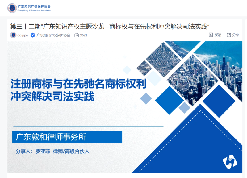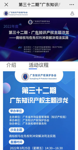 2022年3月25日下午两点半,第三十二期“广东知识产权主题沙龙”直播正式开播,直播间邀请了广州知识产权法院四级高级法官裘晶文,广东敦和律师事务所高级合伙人罗亚菲和广东格林律师事务所主任、高级合伙人杨河三位嘉宾,就“商标权与在先权利冲突解决司法实践”进行交流分享。