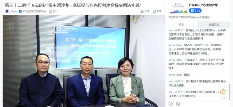 专家主题分享过后,沙龙直播进入线上互动交流环节。观看直播代表通过线上讨论区与三位专家就“注册商标与驰名商标的冲突与诉讼”“商标权与名人姓名冲突”“版权与商标的实质性相似认定”“店面装潢主张不正当竞争”等相关问题进行讨论和交流。