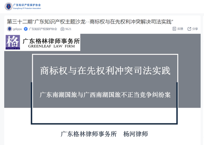 杨河律师的分享以“广东南湖国旅与广西南湖国旅不正当竞争纠纷案”为主题展开,分别从一审案件基本情况、一审争议焦点、二审上诉请求、二审争议焦点等方面分享案件处理经验,并就商标权与在先权利冲突给出独特的见解。