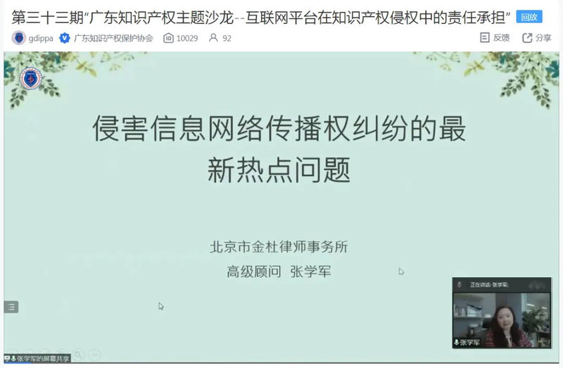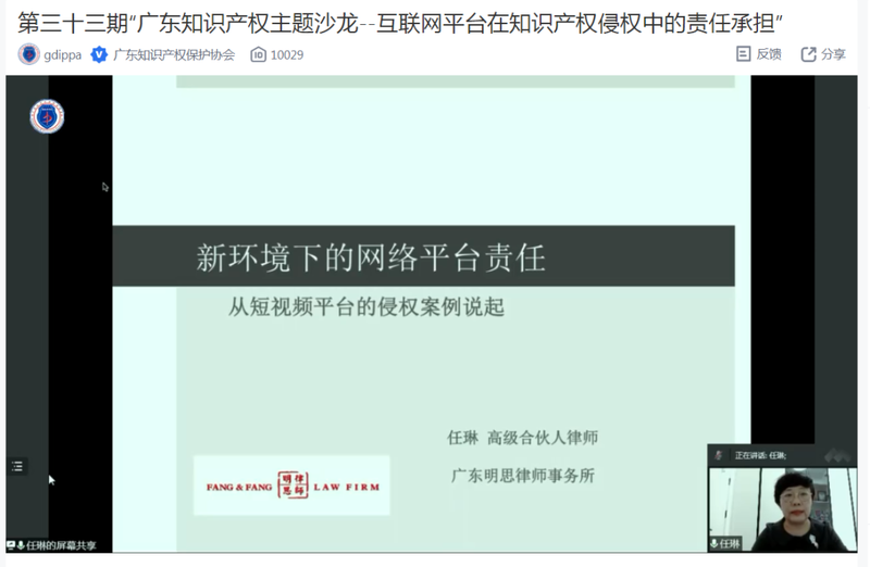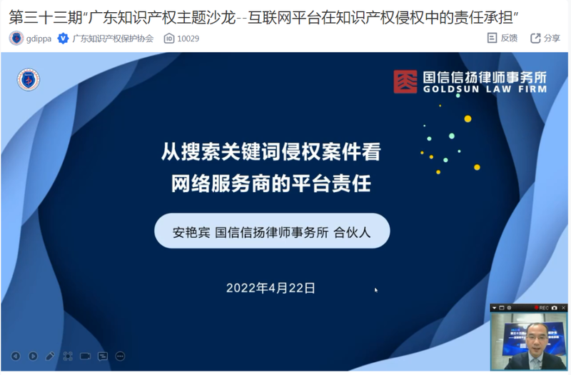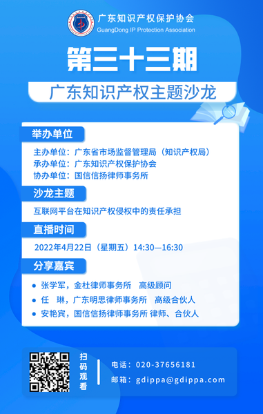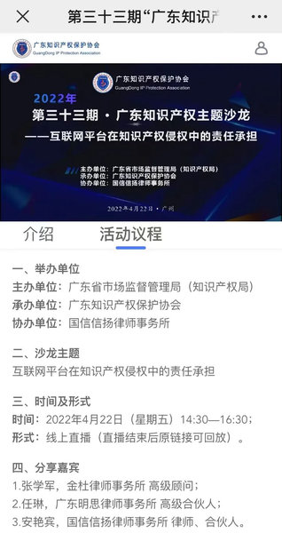 2022年4月22日下午两点半,第三十三期“广东知识产权主题沙龙”直播正式开播,直播间邀请了金杜律师事务所高级顾问张学军、广东明思律师事务所高级合伙人任琳和国信信扬律师事务所合伙人安艳宾三位嘉宾,就“互联网平台在知识产权侵权中的责任承担”进行交流分享,其中张学军顾问及任琳律师以线上会议的方式接入直播间。