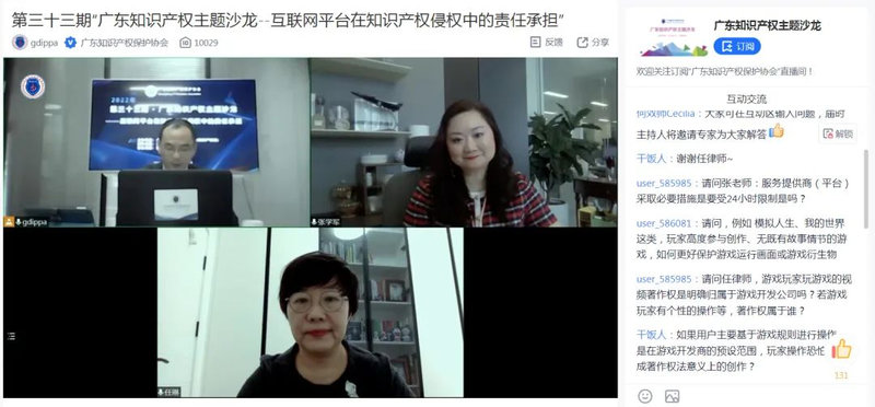 专家主题分享过后,沙龙直播进入线上互动交流环节。观看直播代表通过线上讨论区与三位专家就“服务提供商24小时限制”“游戏著作权权属”“商标使用人搭便车行为”等相关问题进行讨论和交流。