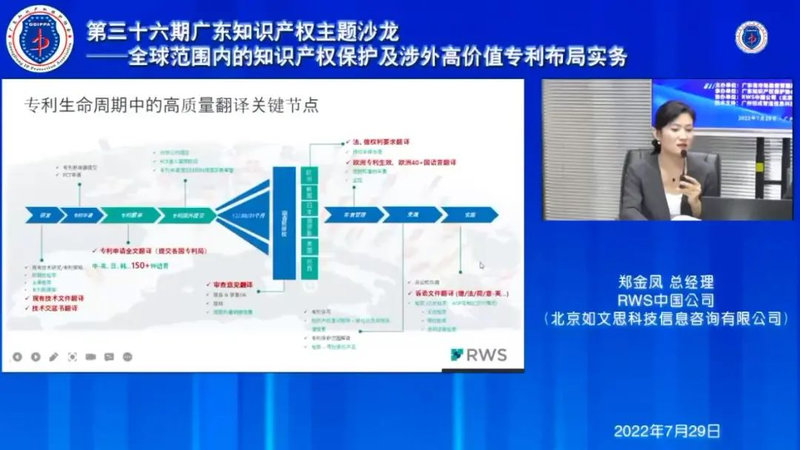 郑金凤总经理以“高质量翻译发挥作用的关键节点”引入主题,就特定领域的专业性、翻译技术提升效率与一致性、全球多语言内容管理等主题,为听众分享高质量专利翻译的实务工作经验。