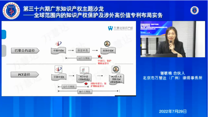 7月29日下午两点半,第三十六期广东知识产权主题沙龙直播正式开播。直播间邀请了北京市万慧达(广州)律师事务所合伙人谢敏楠、摩根路易斯律师事务所律师唐波以及RWS中国公司(北京如文思科技信息咨询有限公司)总经理郑金凤三位嘉宾,就“全球范围内的知识产权保护及涉外高价值专利布局实务”进行交流分享。