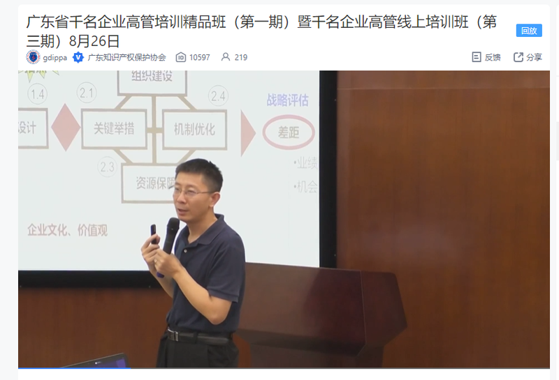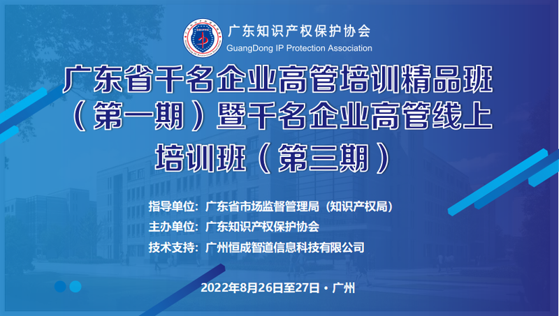 为进一步提升我省科技创新型企业知识产权高管人才业务水平,提高企业知识产权运用与保护意识,在广东省市场监督管理局(知识产权局)指导下,广东知识产权保护协会主办的广东省“千名企业高管培训精品班(第一期)暨千名企业高管线上培训班(第三期)”于2022年8月26日上午正式开班。