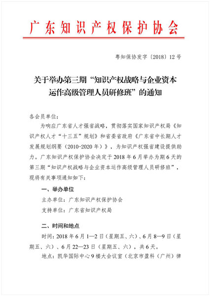 粤知保协发字〔2018〕12号-关于举办第三期知识产权战略与企业资本运作高级管理人员研修班的通知