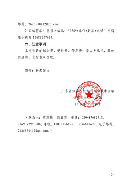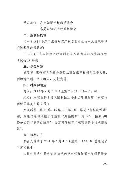 粤知职办发字〔2018〕4号-关于举办“广东省知识产权专利专业技术资格评审申报宣讲会(东莞站)的通知”