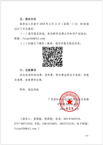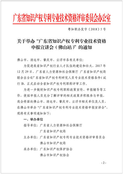 粤知职办发字〔2018〕5号-关于举办广东省知识产权专利专业技术资格申报宣讲会(佛山站)的通知