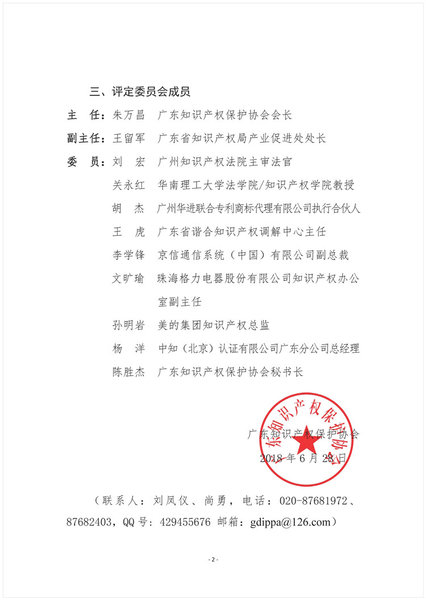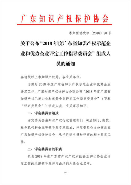 粤知保协发字〔2018〕20号-关于公布“2018年广东省知识产权示范企业和优势企业评定工作指导委员会”组成人员的通知