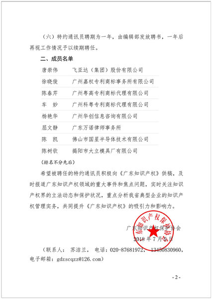 粤知保协发字〔2018〕22号-关于确定《广东知识产权》第一批特约通讯员名单的通知