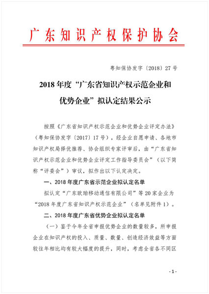 2018 年度“广东省知识产权示范企业和优势企业”拟认定结果公示
