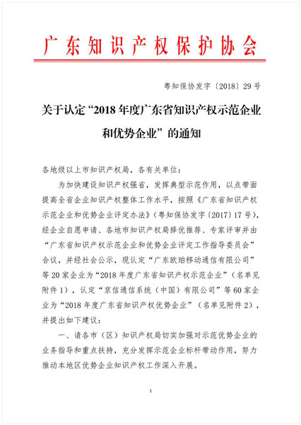 粤知保协发字〔2018〕29号-关于认定2018年度广东省知识产权示范示范企业和优势企业的通知