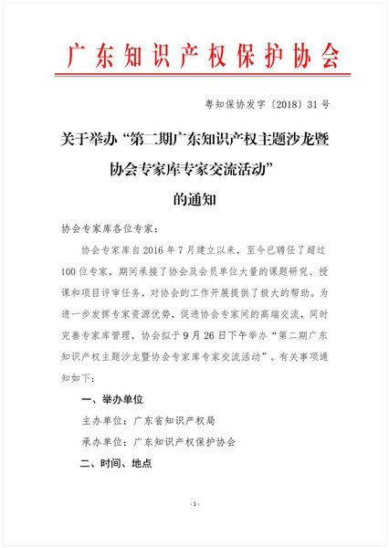 粤知保协发字〔2018〕31号-关于举办“第二期广东知识产权主题沙龙暨协会专家库专家交流活动”的通知
