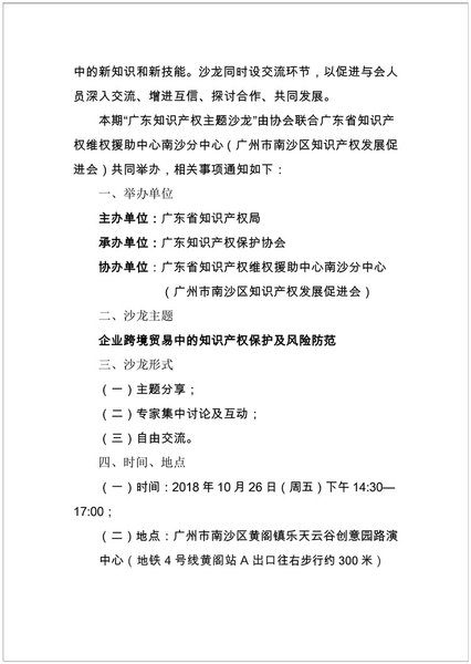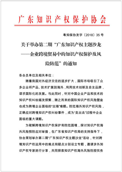 粤知保协发字〔2018〕35号-关于举办第二期“广东知识产权主题沙龙——企业跨境贸易中的知识产权保护及风险防范”的通知