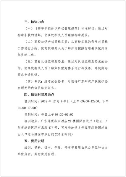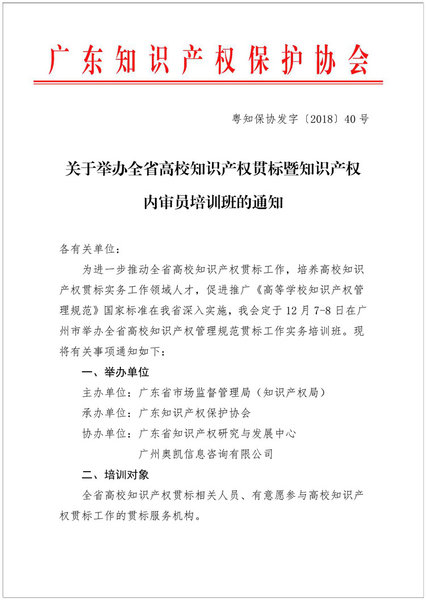 粤知保协发字〔2018〕40号-关于举办全省高校知识产权贯标暨知识产权内审员培训班的通知