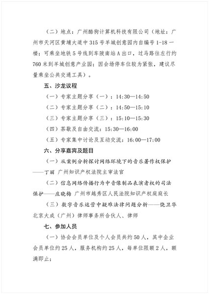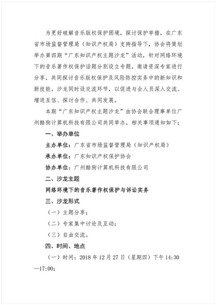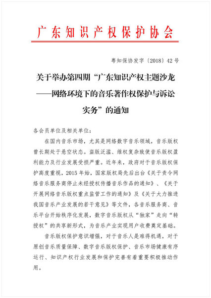 粤知保协发字〔2018〕42号-关于举办第四期“广东知识产权主题沙龙——网络环境下的音乐著作权保护与诉讼实务”的通知
