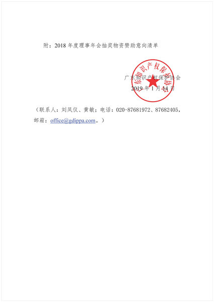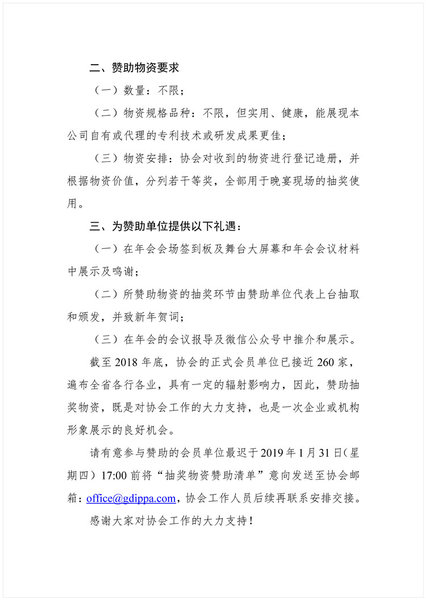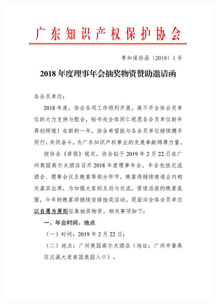 粤知保协函〔2019〕1号-广东知识产权保护协会2018年度理事年会抽奖物资赞助邀请函