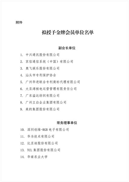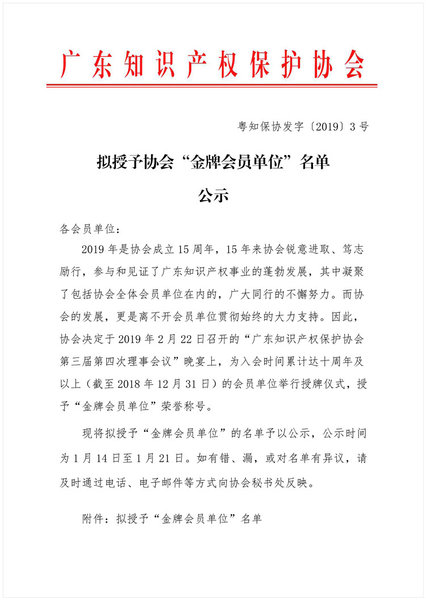粤知保协发字〔2019〕3号-拟授予协会“金牌会员单位”名单公示