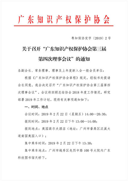 粤知保协发字〔2019〕2号-关于召开“广东知识产权保护协会第三届第四次理事会议”的通知