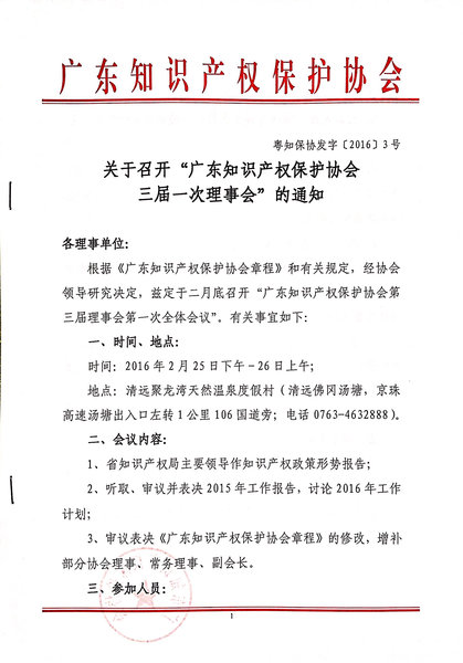 关于召开“广东知识产权保护协会 三届一次理事会”的通知