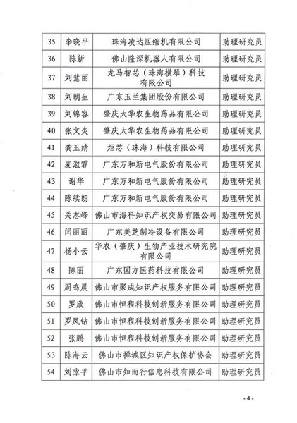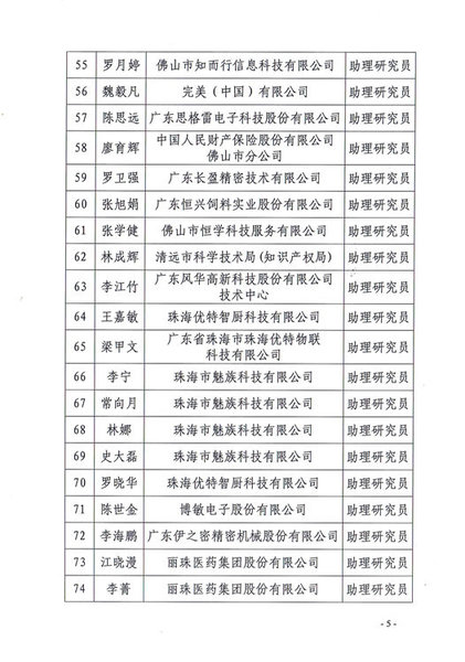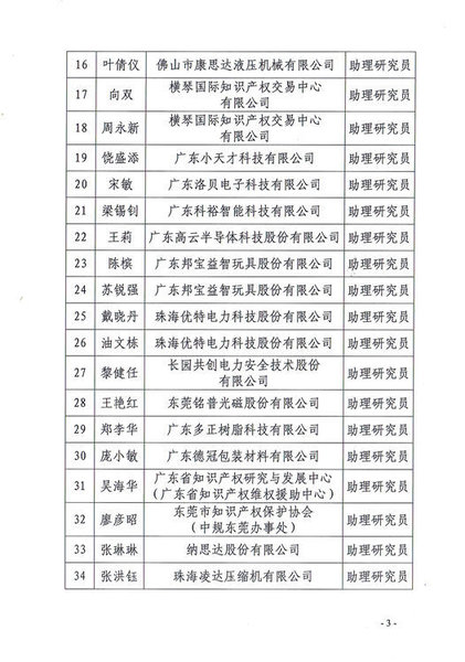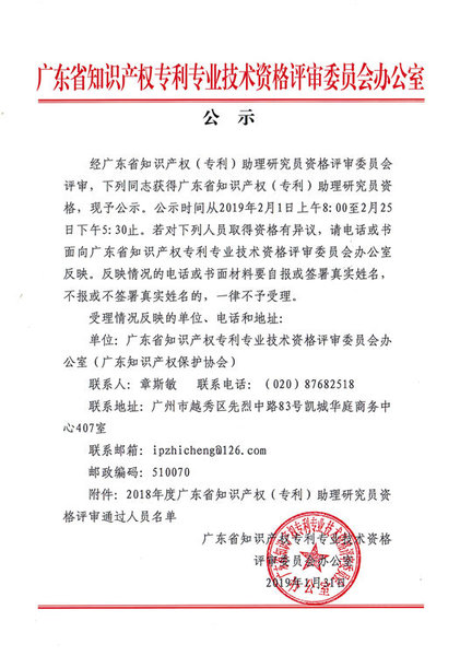 广东省知识产权专利专业技术资格评审委员会办公室关于2018年度广东省知识产权(专利)助理研究员资格评审通过人员名单的公示