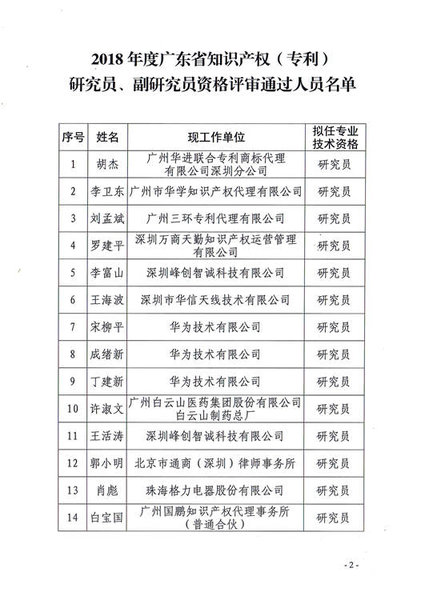 广东省知识产权专利专业技术资格评审委员会办公室关于2018年度广东省知识产权(专利)研究员、副研究员资格评审通过人员名单的公示