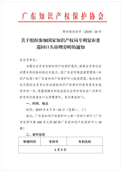 粤知保协发字〔2019〕10号-关于组织参加国家专利复审委巡回口头审理旁听的通知