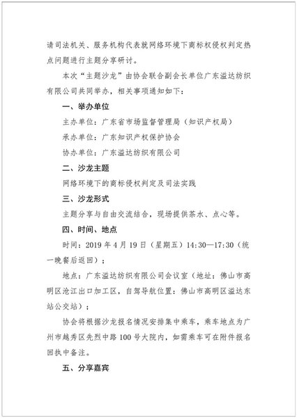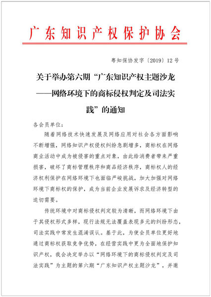粤知保协发字〔2019〕12号-关于举办第六期“广东知识产权主题沙龙——网络环境下的商标侵权判定及司法实践”的通知