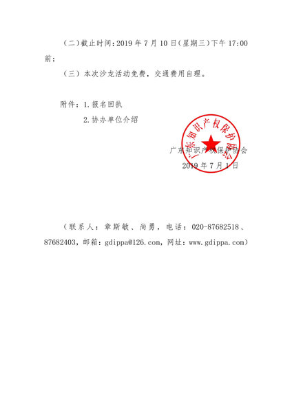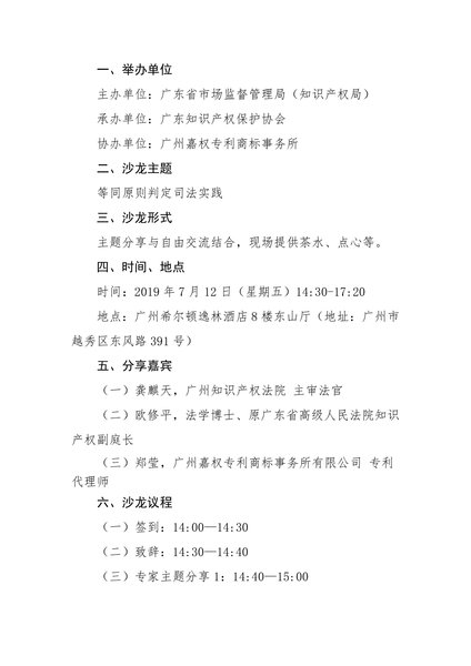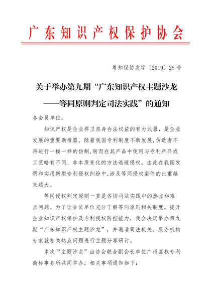 粤知保协发字〔2019〕25号-关于举办第九期“广东知识产权主题沙龙 ——等同原则判定司法实践”的通知