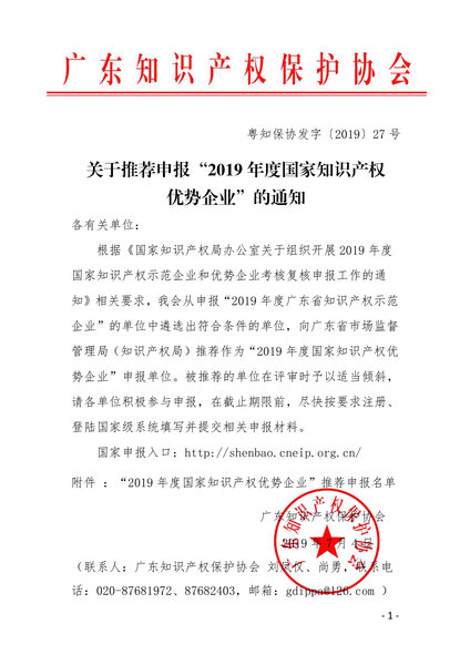 粤知保协发字〔2019〕27号-关于推荐申报“2019年度国家知识产权优势企业”的通知