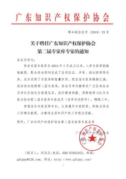 粤知保协发字〔2019〕33号-关于聘任广东知识产权保护协会第二届专家库专家的通知