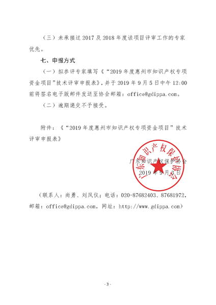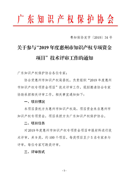 粤知保协发字〔2019〕34号-关于承接“2019年度惠州市知识产权专项资金项目”技术评审工作的通知