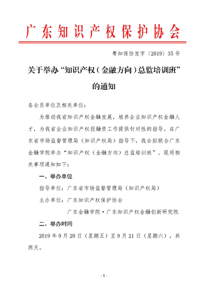 粤知保协发字〔2019〕35号-关于举办“知识产权总监培训班(金融方向)”的通知