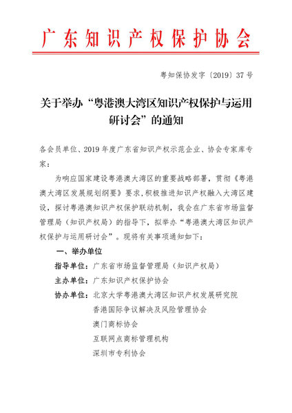 粤知保协发字〔2019〕37号-关于举办“粤港澳大湾区知识产权保护与运用研讨会”的通知