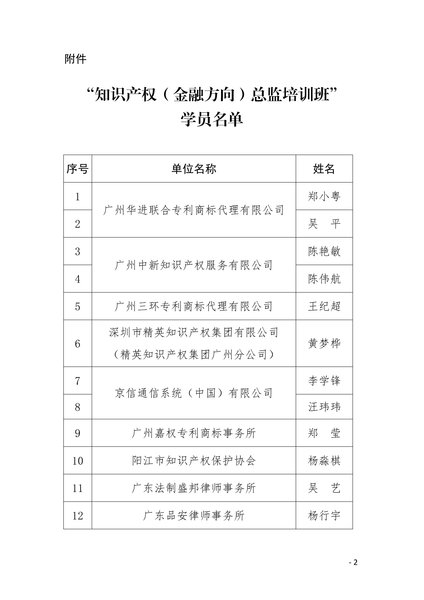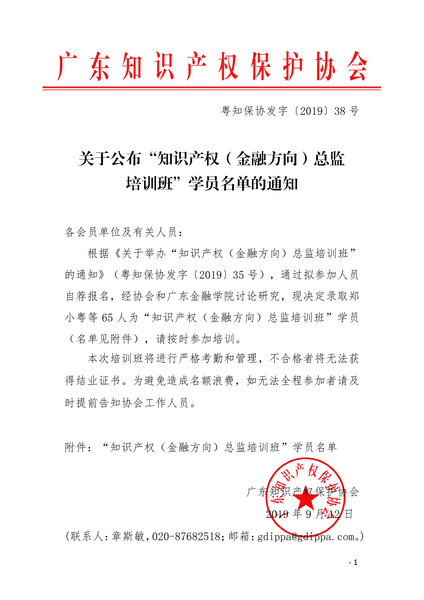 粤知保协发字〔2019〕38号-关于公布“知识产权(金融方向)总监培训班”学员名单的通知