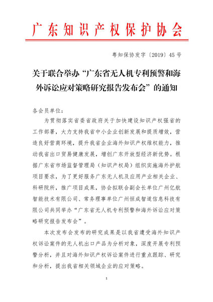 粤知保协发字〔2019〕45号-关于联合举办“广东省无人机专利预警和海外诉讼应对策略研究报告发布会”的通知