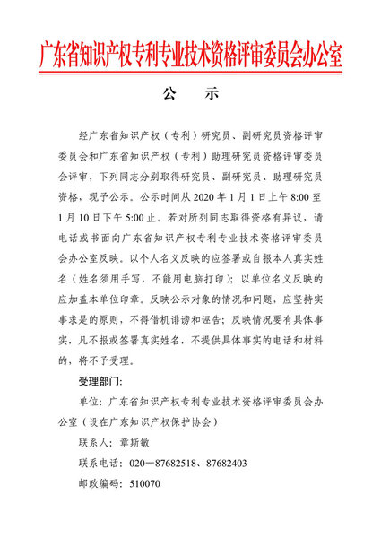关于2019年度广东省知识产权(专利)高、中级资格评审通过人员名单的公示