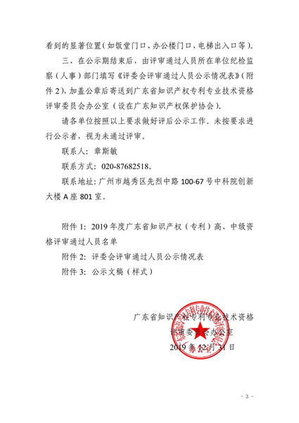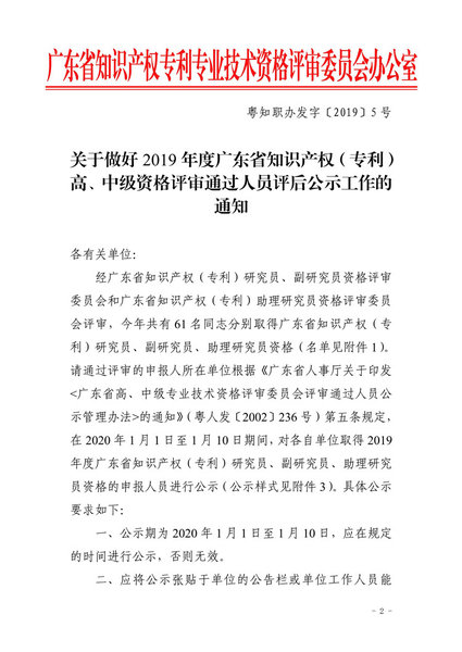 粤知职办发字〔2019〕5号—关于做好2019年度广东省知识产权(专利)高、中级资格评审通过人员评后公示工作的通知
