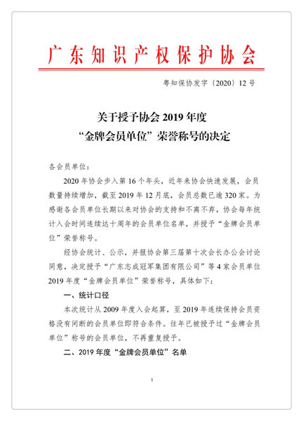 粤知保协发字〔2020〕12号-关于授予协会2019年度“金牌会员单位”荣誉称号的决定