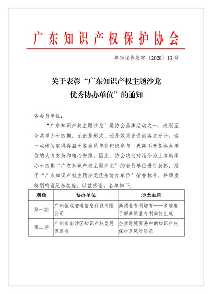粤知保协发字〔2020〕13号-关于表彰“广东知识产权主题沙龙优秀协办单位”的通知