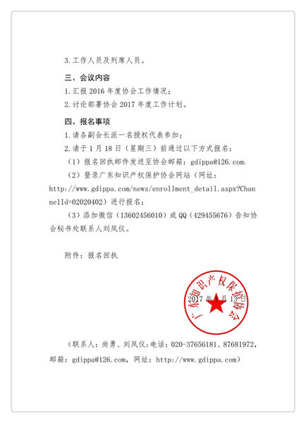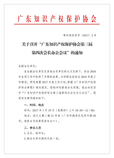粤知保协发字〔2017〕2号-关于召开“广东知识产权保护协会第三届四次会长办公会议”的通知