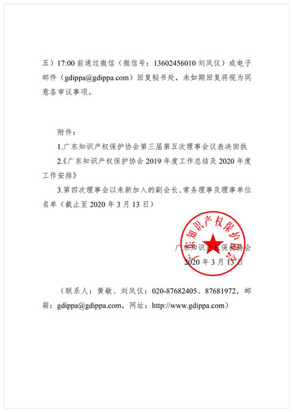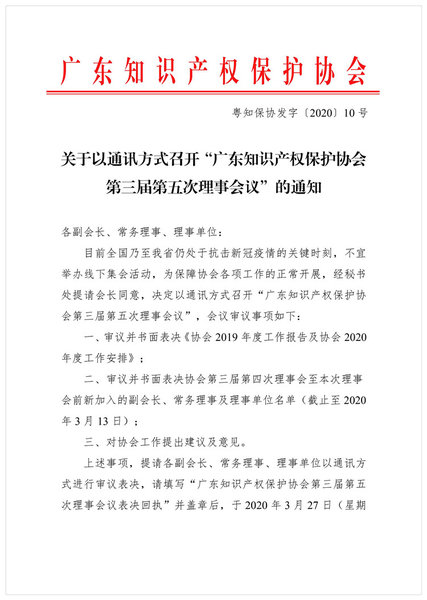 粤知保协发字〔2020〕10号-关于以通讯方式召开“广东知识产权保护协会第三届第五次理事会议”的通知