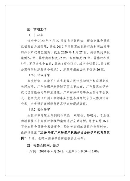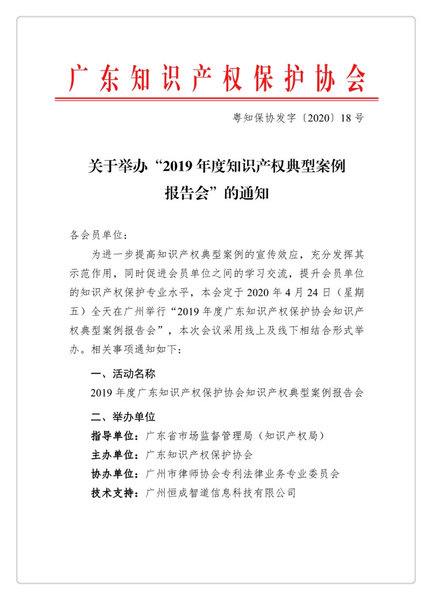 粤知保协发字〔2020〕18号-关于举办“2019年度知识产权典型案例报告会”的通知