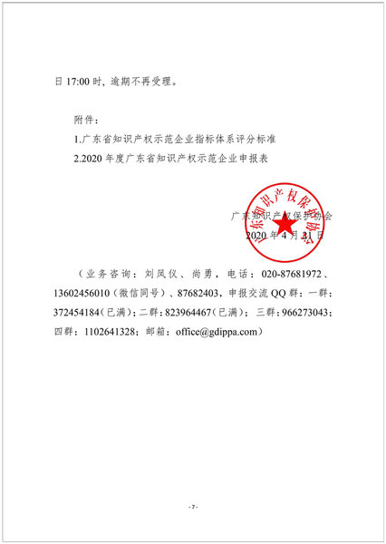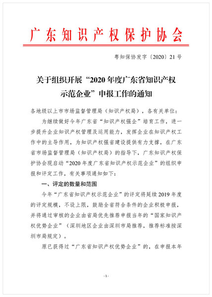 粤知保协发字〔2020〕21号-关于组织开展“2020年度广东省知识产权示范企业”申报工作的通知