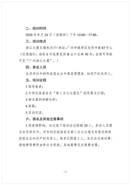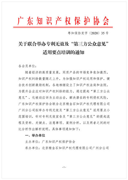 粤知保协发字〔2020〕35号-关于举办专利无效及“第三方公众意见”适用要点培训会议的通知