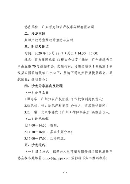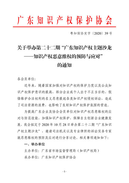 粤知保协发字〔2020〕39号-关于举办第二十二期“广东知识产权主题沙龙——知识产权恶意维权的预防与应对”的通知