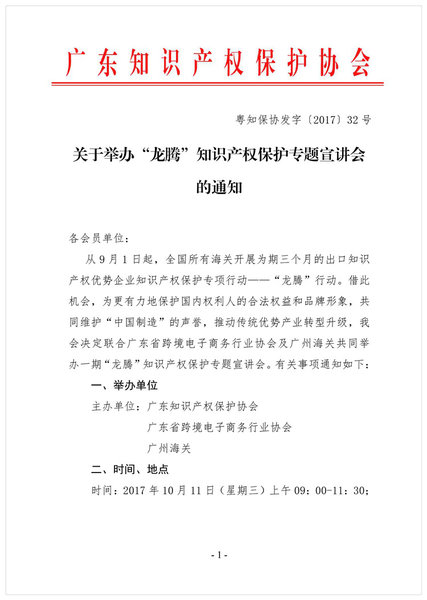 粤知保协发字〔2017〕32号-关于举办“龙腾”知识产权保护专题宣讲会的通知