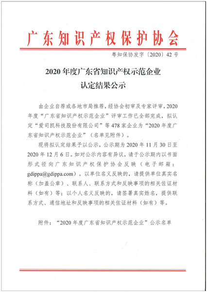 粤知保协发字〔2020〕42号-2020年度广东省知识产权示范企业认定结果公示